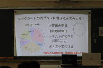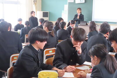 午後は各ホームルームに生徒会役員と有志の先輩生徒が2名ずつ加わり、太田東高校生としての心構えについて話してもらいました。簡単なアイスブレイクを行ったあと、どうしたら家庭学習時間を確保できるのかについてグループワークで議論を交わしたほか、充実した高校生活を送るために先輩から体験談をもとにアイデアが伝授されました。どのクラスも楽しく、意欲的に活動している姿が印象的でした。