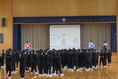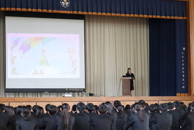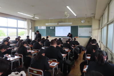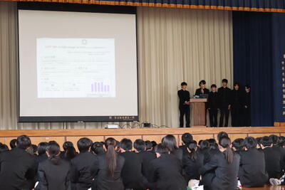 1日目は、職員から学習・生活両面に関する説明があったほか、先輩による総合成果発表会が行われました。2年次の生徒からは「どうすれば地域の人たちが昼夜問わず安全に生活できるか」をテーマに探究した成果について、3年次の生徒からはネパールでのボランティア活動について発表がありました。