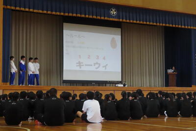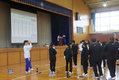 2日目は、改めて年次団からの自己紹介と校歌指導のあと、オリエンテーションの集大成としてクラス対抗レクを行いました。 生徒会役員と有志が進行役を務め、「バースデーライン」や「伝言絵ゲーム」、「ドッジビー」などの複数のレクで得点を競いました。4組が見事優勝を飾り、最後に行われた表彰式も大いに盛り上がりました。順位を競いながらも、クラスメイトと和やかな雰囲気で楽しんでいる姿が印象的でした。