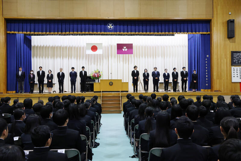 続く離退任式では、今年度で転退任される先生方の紹介と挨拶がありました。先生方から、最後のメッセージが投げかけられ、生徒は真剣な眼差しで話を聞いていました。先生方のこれからのご活躍とご多幸を祈念いたします。
